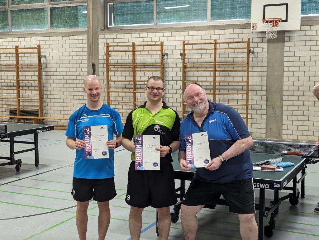 Die größte Gruppe im Einzel war die B-Klasse mit 14 Teilnehmern*innen. Nach Vorrundenspielen in 4er und 5er-Gruppen ging es mit KO-Spielen im Viertelfinale weiter. In einem knappen Finale setzte sich Björn B gegen Kai durch. Platz 3 sicherte sich Björns Bruder, Jens im kleinen Finale gegen Katja. (Foto oben Jens, Björn und Kai)